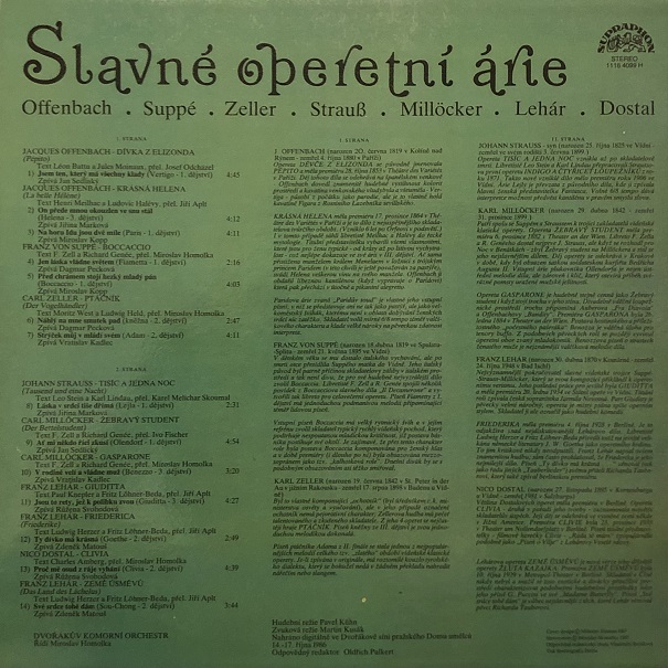 Offenbach, Suppé, Zeller, Strauß, Millöcker, Lehár, Dostal‎– Slavné Operetní Árie (LP, 1990, Československo)